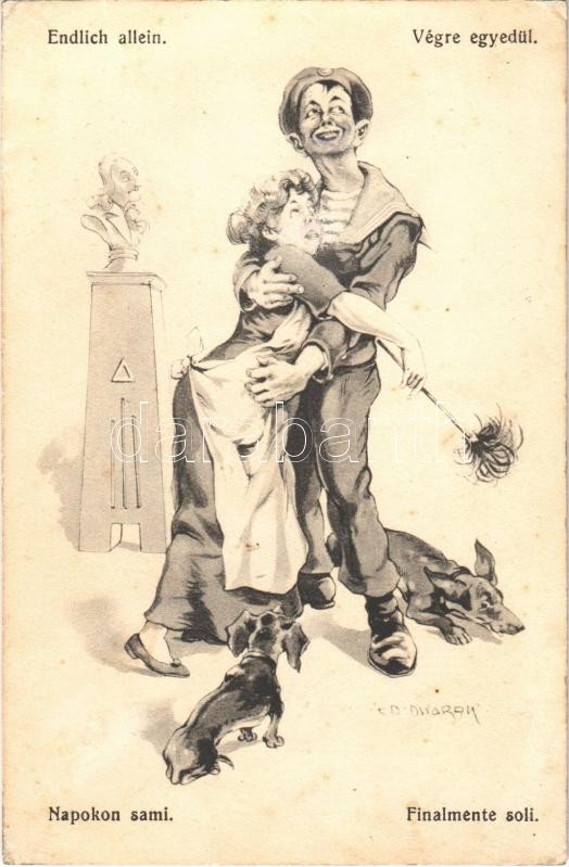 Leírás: Endlich Allein! K.u.K. Kriegsmarine Matrose / Napokon sami! / Végre egyedül! / Finalmente soli! / Finally alone! Austro-Hungarian Navy humorous mariner art postcard. C.F.P. 43.a. 1917/18. s: Ed. Dworak