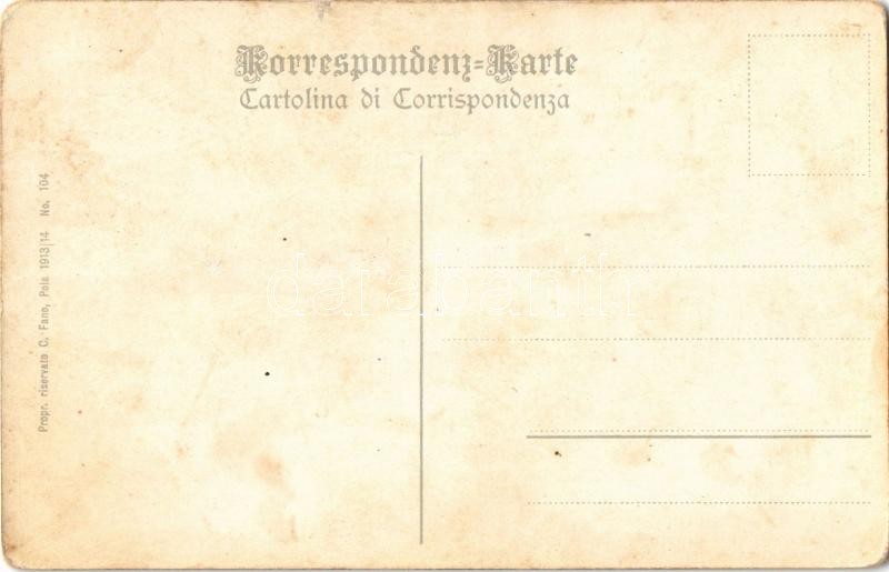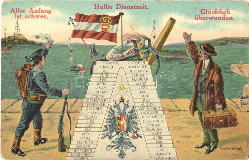 K.u.K. Kriegsmarine SMS Viribus Unitis. Aller Anfang ist schwer. Halbe Dienstzeit. Glücklich überwunden / Austro-Hungarian Navy calendar with mariner. C. Fano Pola 1913/14. No. 104. s: Ed. Dworak (fl)