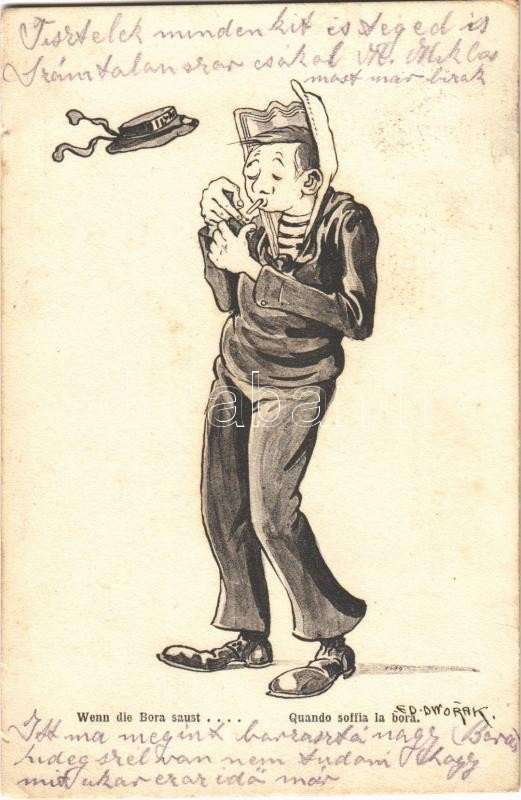 Wenn die Bora saust / Quando soffia la bora / K.u.K. Kriegsmarine Matrose / Austro-Hungarian Navy mariner humour art postcard. G. Fano, Pola 1910-11. 1636. s: Ed. Dworak (EK)