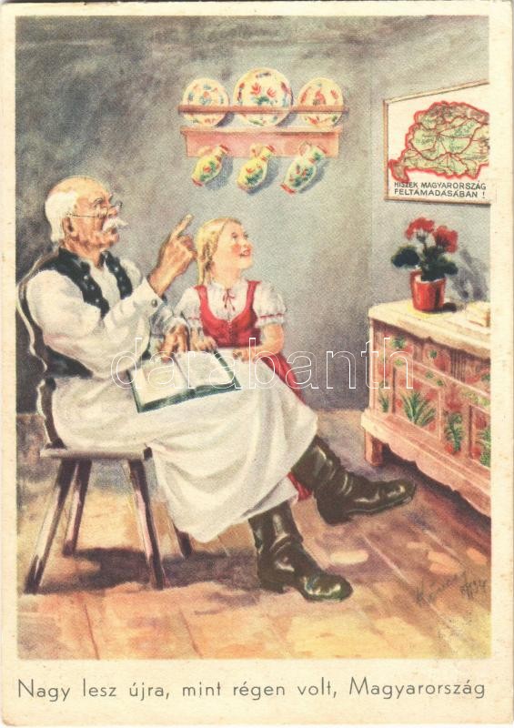 Nagy lesz újra, mint régen volt, Magyarország. Hiszek Magyarország feltámadásában! Magyar Nemzeti Szövetség, Magyar Földrajzi Intézet rt. / Hungarian irredenta propaganda, folklore, Trianon map. s: Köves