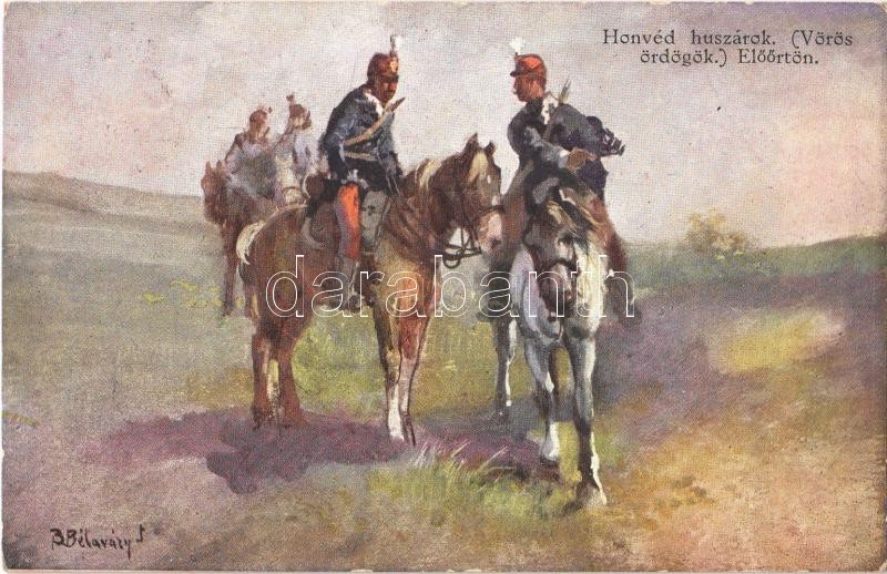 Leírás: 1914 Honvéd huszárok (Vörös ördögök) előőrsön / Hungarian hussars. B.K.W.I. 889-6. s: B. Bélaváry I.