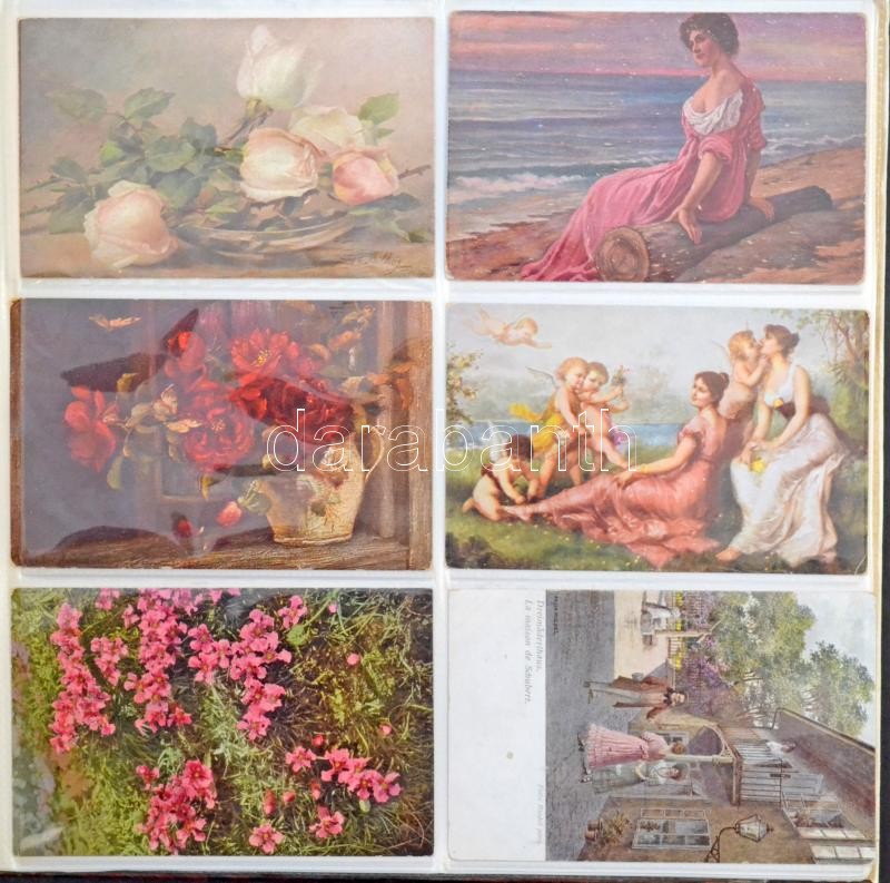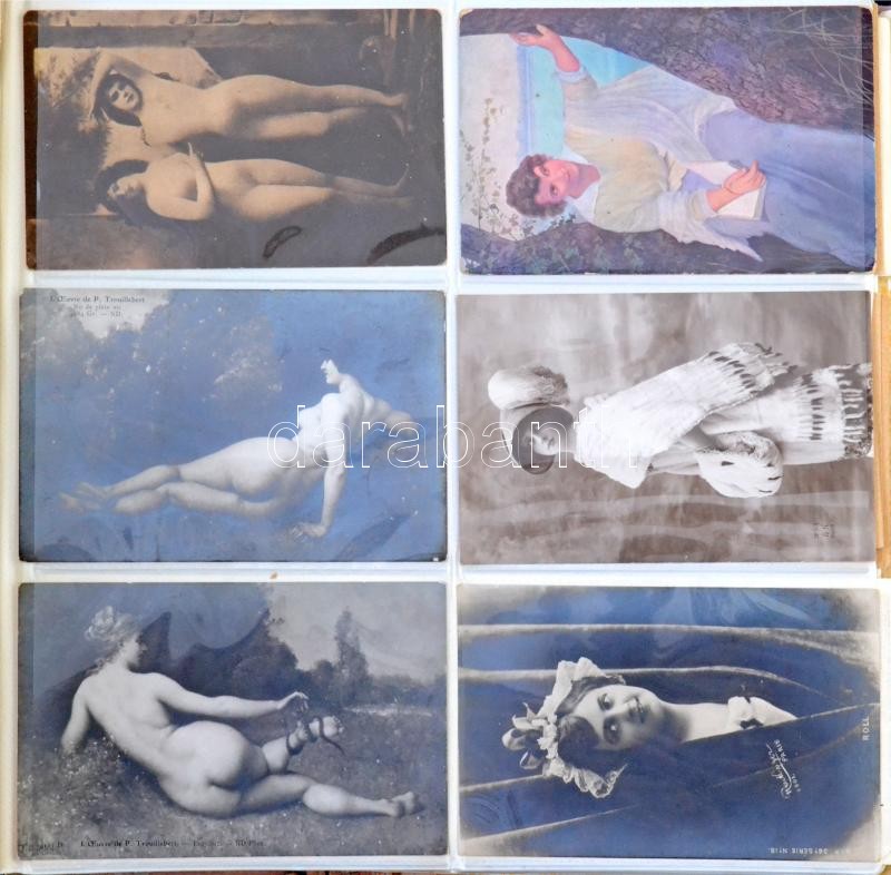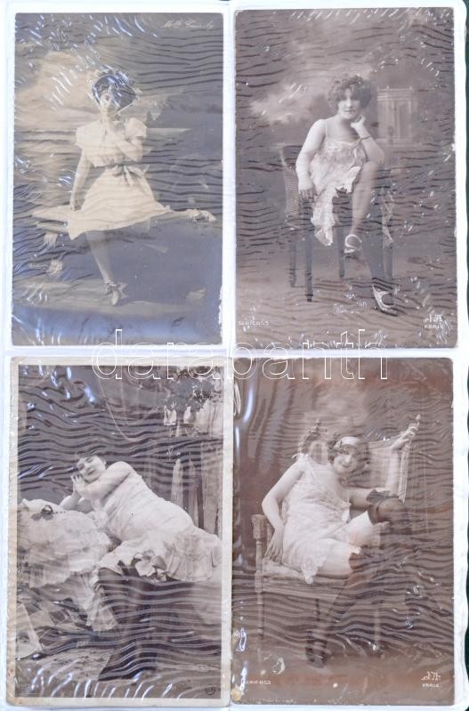 Kb. 60 db RÉGI motívum képeslap vegyes minőségben 4 db képeslapalbumban: hölgyek és erotikus / Cca. 60 pre-1945 motive postcards in mixed quality in 4 postcard albums: lady and erotic
