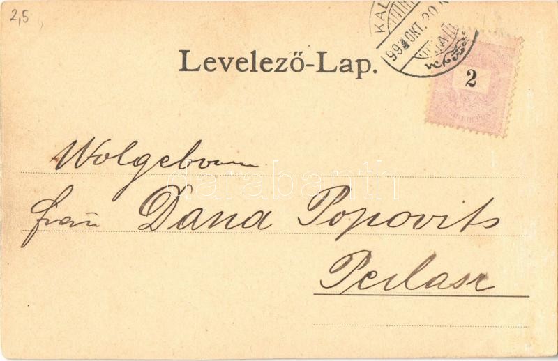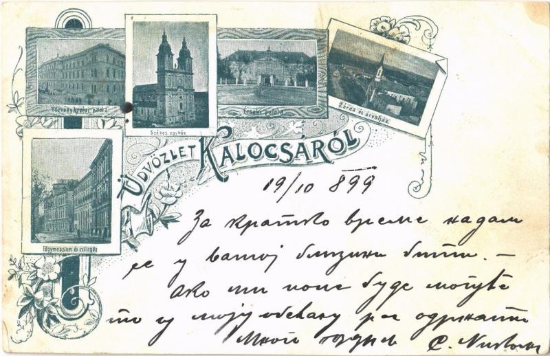 Leírás: 1899 Kalocsa, Törvénykezési palota, Székesegyház, Érseki palota, Zárda és árvaház, Főgimnázium és csillagda (obszervatórium). Art Nouveau, floral (vágott / cut)
