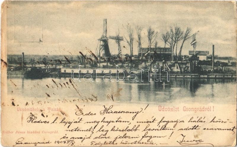Leírás: 1903 Csongrád, Úszóműhely a Tiszán, szélmalom. Szilber János kiadása (kopott sarkak / worn corners)