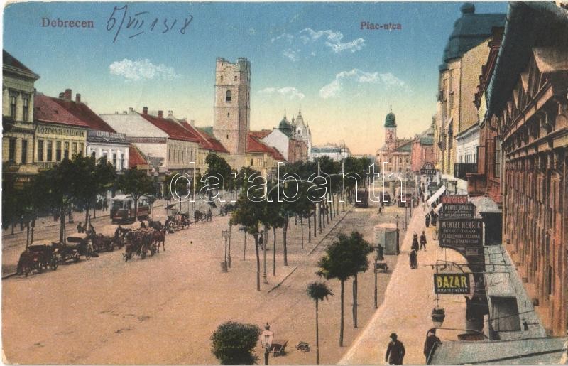 Leírás: 1918 Debrecen, Piac utca, Mentze Henrik, Fisch Testvérek üzlete, Kossuth patika, gyógyszertár, Központi szálloda, villamos (EK)