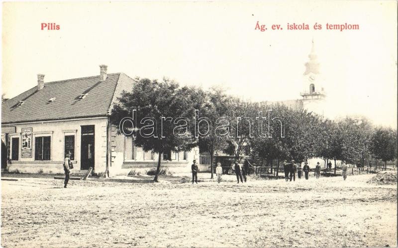1918 Pilis, Evangélikus iskola és templom, vasszerszám üzlet https://www.darabanth.com/hu/363-Gyorsarveres/363.0/Kepeslapok/Magyarorszag~1500005/1918-Pilis-Evangelikus-iskola-es-templom-vasszerszam-uzlet~II2100559