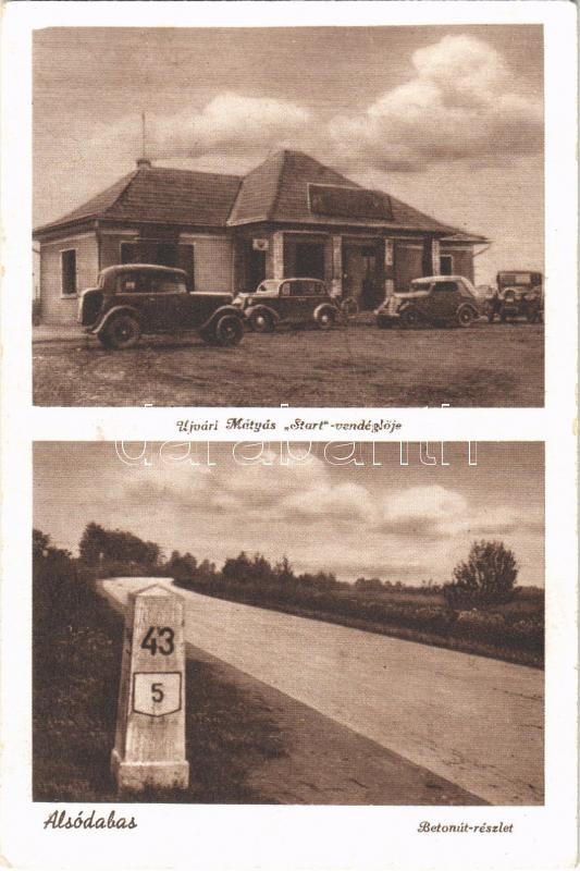 Leírás: Dabas, Alsódabas; Ujvári Mátyás "Start" vendéglője, automobilok, betonút részlet