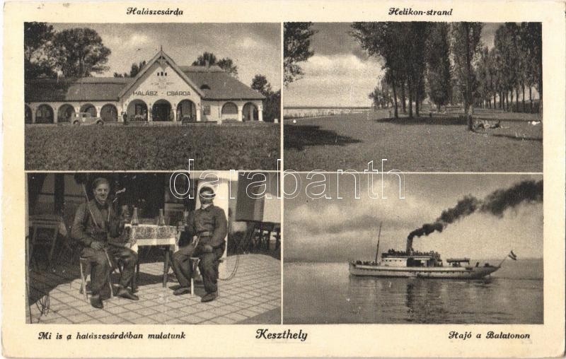 Leírás: Keszthely, Halászcsárda, Helikon-strand, mulatók a halászcsárdában, gőzhajó a Balatonon