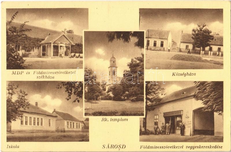 Leírás: Sárosd, MDP és Földmívesszövetkezet székháza, Községháza, Római katolikus templom, Iskola, Földmívesszövetkezet vegyeskereskedése