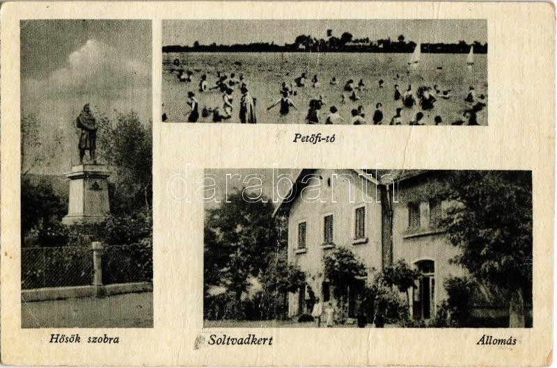 Leírás: Soltvadkert, Petőfi tó, strand, fürdőzők, Hősök szobra, emlékmű, Vasútállomás. Kiadja Csóti Ferenc (fa)