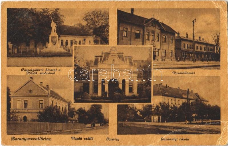 Szentlőrinc, Baranyaszentlőrinc; Főszolgabírói hivatal a Hősök szobrával, vasútállomás, vasúti szálló, kastély, gazdasági iskola. Aigner Lajos kiadása (EK)