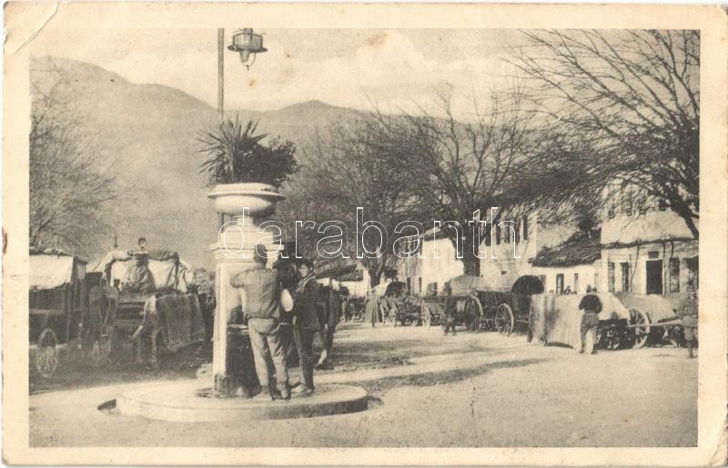 Leírás: 1917 Rijeka Crnojevica, Hauptplatz und Brunnen / main square, fountain, vendors, soldiers + "K.u.K. Kommando des Turmfort Goorazda" (fa)
