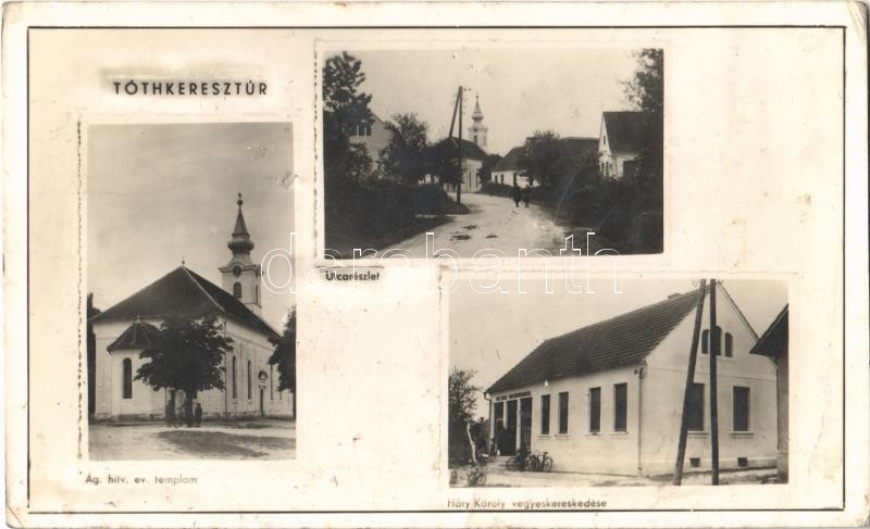 Leírás: 1942 Tótkeresztúr, Krisevczi, Krizevci (Péterhegy, Felső-Petrócz, Gornji Petrovci); Ágostai hitvallású evangélikus templom, utcarészlet, Háry Károly vegyeskereskedése / Lutheran church, street, shop (kis szakadás / small tear)