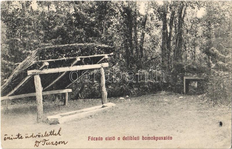 Leírás: 1913 Deliblát, Deliblato; Fácánetető a deliblati homokpusztán / Deliblatska Pescara / pheasant feeder in the Deliblato Sands
