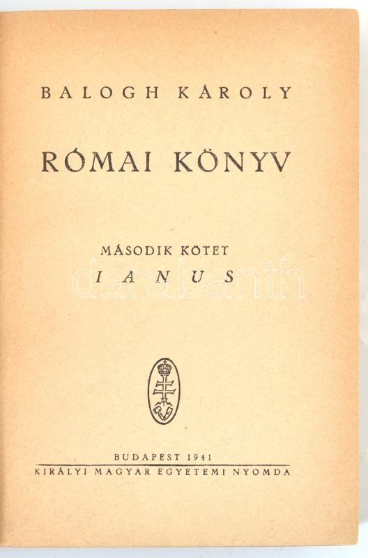 Balogh Károly: Római könyv. II. kötet, Ianus. Bp., 1941, Királyi Magya... https://www.darabanth.com/hu/363-Gyorsarveres/363.0/Konyvek/Konyvek-Egyeb-ritkasagok~1000018/Balogh-Karoly-Romai-konyv-II-kotet-Ianus-Bp-1941-Kiralyi-Magyar-Egyetemi-Nyomda-Kiado~II2094112