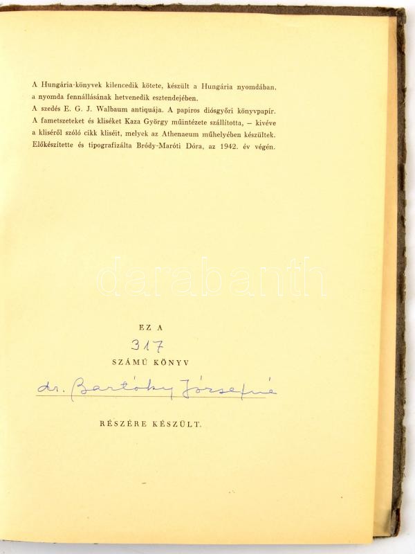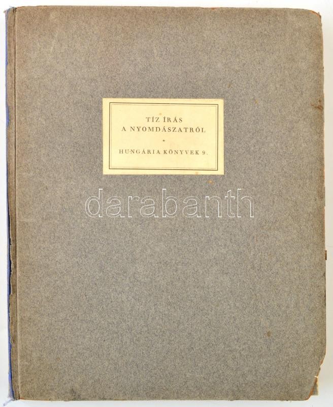 Tíz írás a nyomdászatról. Előszó Bárczy István. Írták: Fitz József, Szentkúty Pál, Kozma Lajos, Durand Félix, Ferdinandy Gejza, Bródy László, Haiman-Kner György, Boér Pál, Magyary István és Kner Imre. /Hungária Könyvek 9./ Bp., 1942, Hungária ny., 217 p. Szövegközti képekkel gazdagon illusztrálva. Kiadói félvászon kötésben, kopott gerinccel és borítóval, a könyv sarkain sérüléssel, hiánnyal. A könyv számozott és névre szóló példányokban került forgalomba, ez a 317. sz. példány.