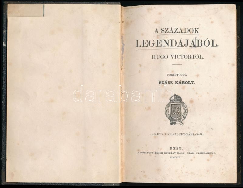 [Victor Hugo]: Hugo Victor: A századok legendájából. Ford.: Szász Károly. Kiadta Kisfaludy-Társaság. Pest, 1862, Emich Gusztáv, XVII+1+159+3 p. Első magyar kiadás. Későbbi átkötött félvászon-kötés, foltos lapokkal, kissé dohos. Ritka!