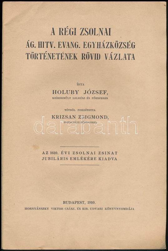 Holuby József: A régi Zsolnai ág. hitv. evang. egyházközség történetének rövid vázlata. Ford.: Krizsán Zsigmond. Bp., 1910, Hornyánszky Viktor, 45 p. Kiadói papírkötés, kissé foltos borítóval. Ritka!