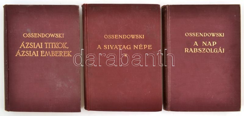 Ossendowski 3 műve: -Ossendowski: A Nap rabszolgái,II.kötet,é.n.Bp Franklin-társulat, egészvászon kötés, enyhén foltos lapokkal,kötésen felirat kopott - Ossendowski:A sivatag népe,é.n.Bp Franklin-társulat,egészvászon kötés,enyhén foltos lapokkal gerincen kopott felirattal -Ossendowski:Ázsiai titkok, ázsiai emberek,é.n.Bp Franklin-társulat,egészvászon kötés,enyhén foltos lapokkal, gerincen kopott felirattal