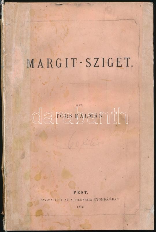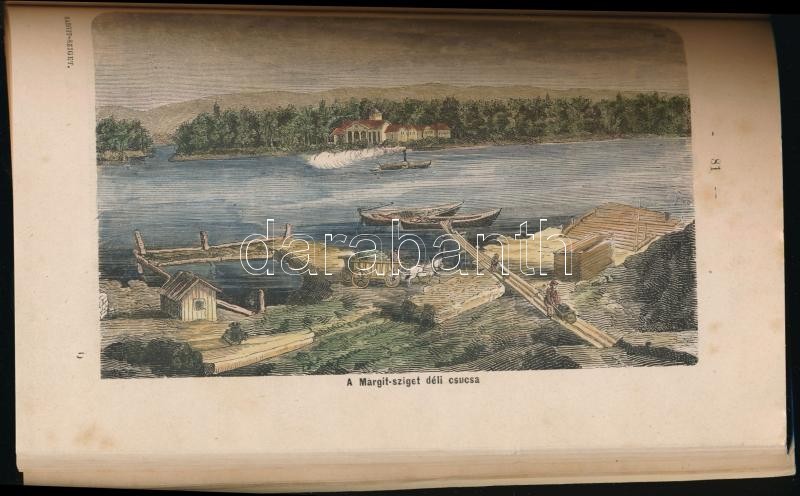 Törs Kálmán: Margit-sziget. Pest, 1872, Athenaeum, 4+137+3 p. Oldalszámozáson belül 11 színezett, fametszetes látképpel illusztrálva, közte 9 egészoldalassal. Kiadói papírkötés,pótolt, amatőr módon javított gerinccel és hátsó borítóval, hiányzó térképpel, 132-137. oldal között hiányzó lapokkal.