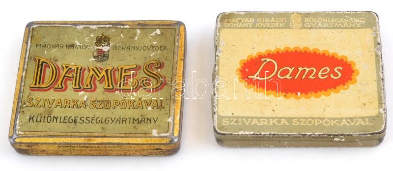Leírás: 2 db fém Dames szivarkadoboz, kopottak, 8×9 cm
