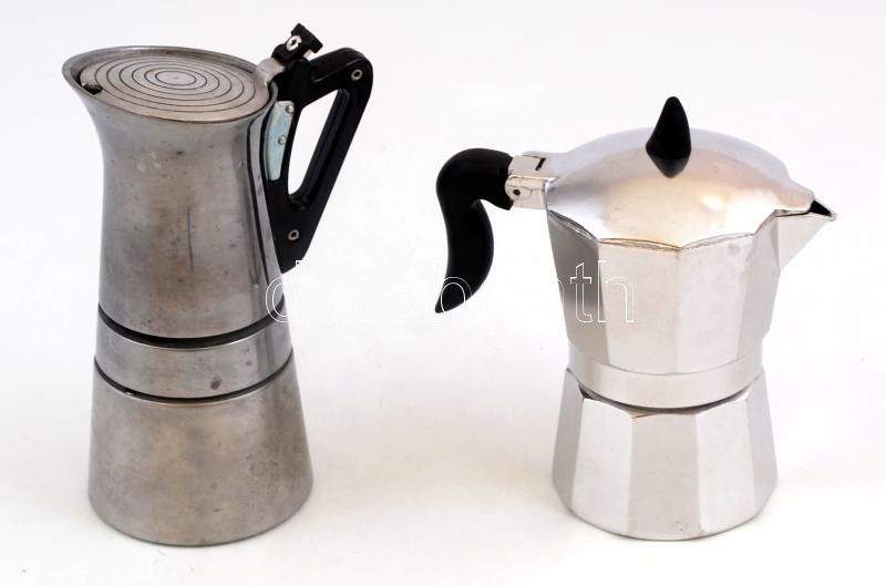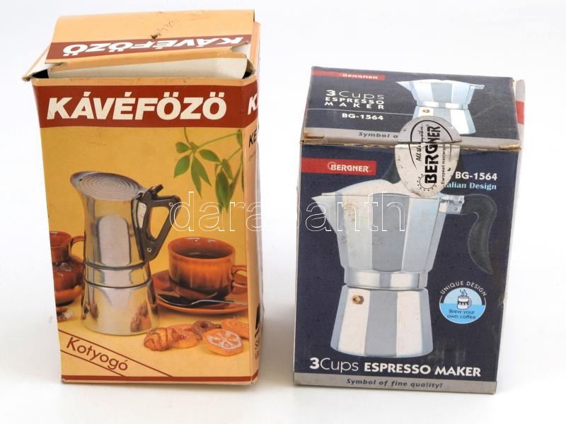 Leírás: 2 db kávéfőző - 3 csészés eszpresszó fém kávéfőző, eredeti dobozában, m: 15 cm + fém kotyogós kávéfőző, eredeti dobozában, m: 18 cm