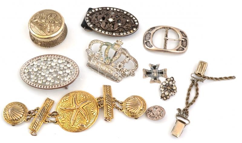 Leírás: Bizsu női övcsatok, fém dobozka, stb.