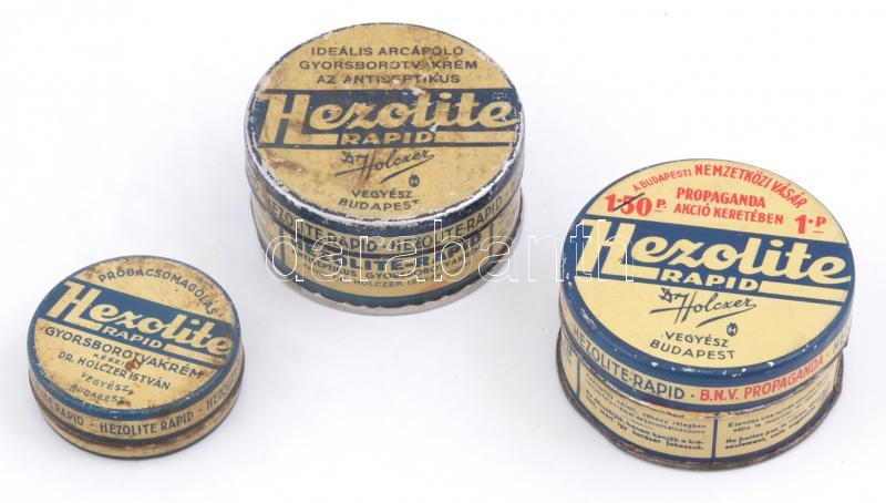 Hezolite fém doboz, 3 db, kopottak, d: 5,5 és 7,5 cm https://www.darabanth.com/hu/363-Gyorsarveres/363.0/Mutargy-papirregiseg-egyeb/Bolhapiac~500012/Hezolite-fem-doboz-3-db-kopottak-d-5-5-es-7-5-cm~II2100834