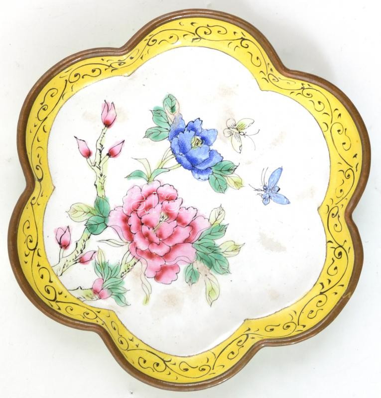 Leírás: Virág mintás zománc tálka, fém, jelzés nélkül, kézzel festett, 12×12 cm