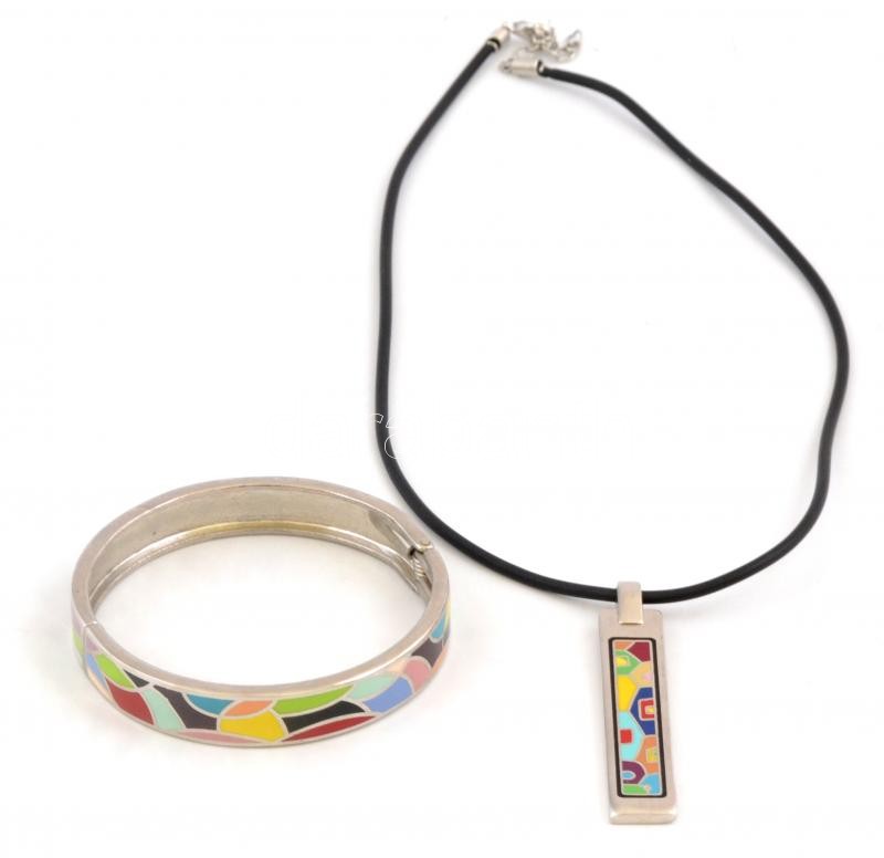 Leírás: Zománcozott bizsu karperec, hozzá illő medállal, láncon, d: 6 cm, h: 44 cm