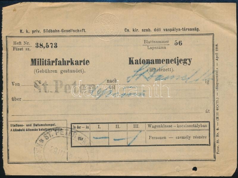 1907 Cs. kir. szab. déli vaspálya-társaság katonamenetjegy https://www.darabanth.com/hu/363-Gyorsarveres/363.0/Mutargy-papirregiseg-egyeb/Militaria~500028/1907-Cs-kir-szab-deli-vaspalya-tarsasag-katonamenetjegy~II2096567