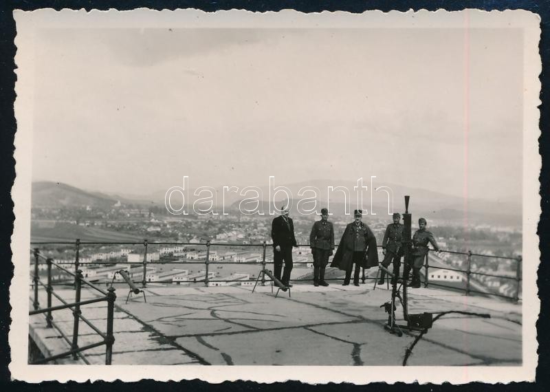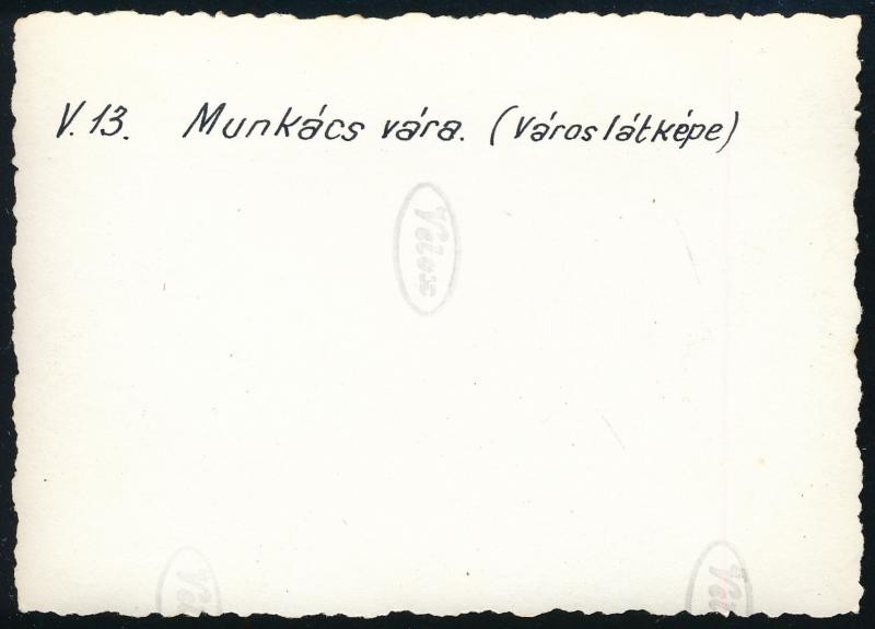 Leírás: cca 1940 Munkácsi városkép a vár teraszáról, előtérben egy készenlétben álló golyószóróval, hátoldalon feliratozott fotó, 5,5×8,5 cm