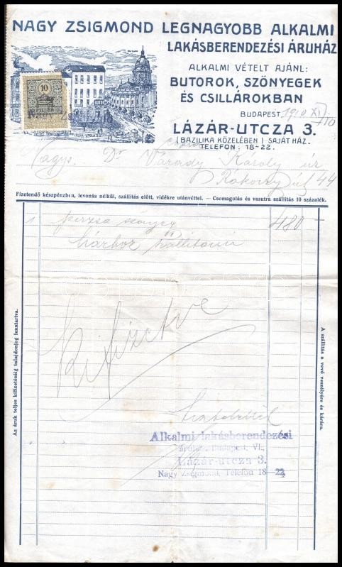 1910 Budapest, Nagy Zsigmond bútor áruház fejléces számla https://www.darabanth.com/hu/363-Gyorsarveres/363.0/Mutargy-papirregiseg-egyeb/Nyomtatvanyok~500030/1910-Budapest-Nagy-Zsigmond-butor-aruhaz-fejleces-szamla~II2078489
