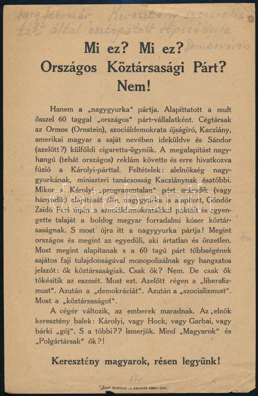 Leírás: 1919 "Mi ez? Országos Köztársasági Párt?" - keresztényszocialisták által osztogatott röplap