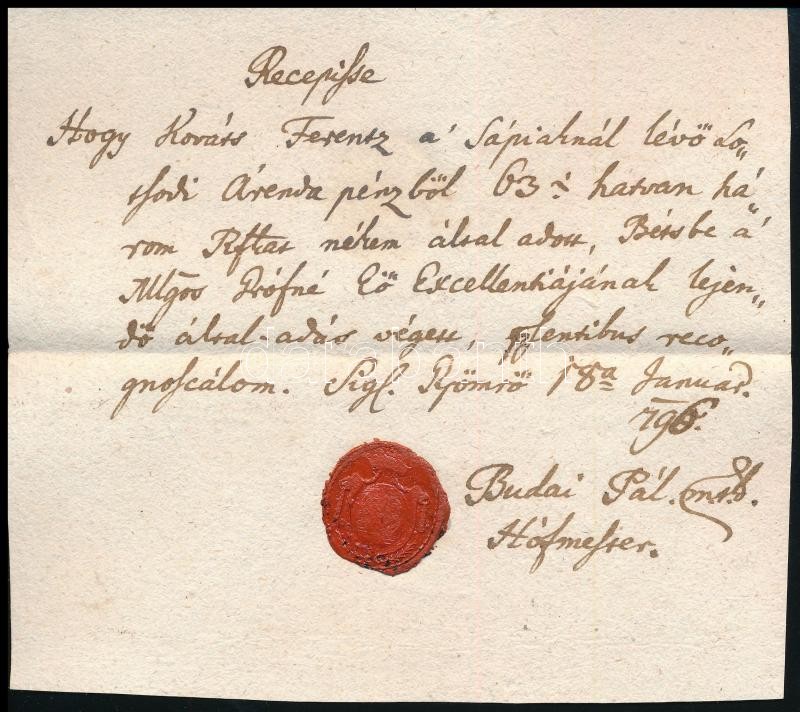 Leírás: 1796 Budai Pál, a gróf Wartensleben család gyömrői birtokának udvarmestere által kiadott igazolás haszonbérleti pénz átvételéről, viaszpecséttel