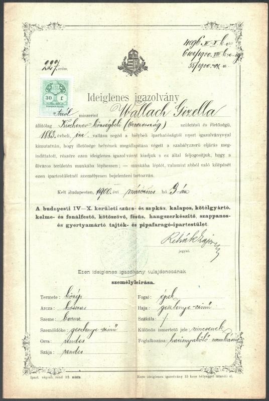 Leírás: 1900 Bp., Izraelita vallású harisnyakötő munkásnő számára kiállított ideiglenes igazolvány okmánybélyeggel
