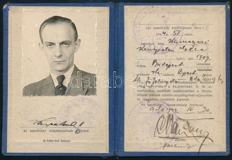 1944 Egyenruha és rangjelzés viselésére jogosító fényképes igazolvány https://www.darabanth.com/hu/363-Gyorsarveres/363.0/Mutargy-papirregiseg-egyeb/Okmanyok~500018/1944-Egyenruha-es-rangjelzes-viselesere-jogosito-fenykepes-igazolvany~II2097250
