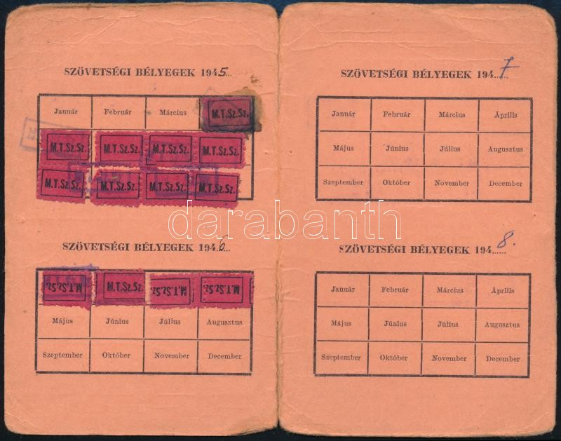 Leírás: 1945 Magyar Tűzoltók Szabad Szakszervezete által kiállított igazolvány tagdíjbélyegekkel