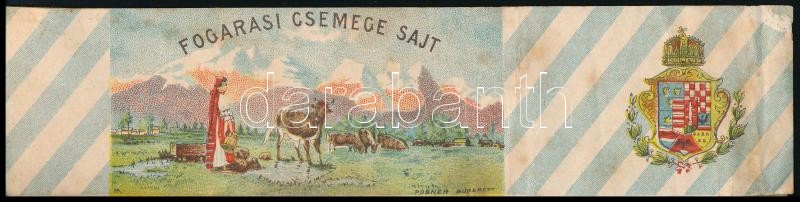 cca 1910 Fogarasi Csemege Sajt címke,, Fogaras, M. Kir. Állami Ménesbirtok, Bp., Posner-ny., litografált, illusztrált, rajta Szent Koronás nagycímerrel, foltos, 4x18 cm, kihajtva: 4x36 cm