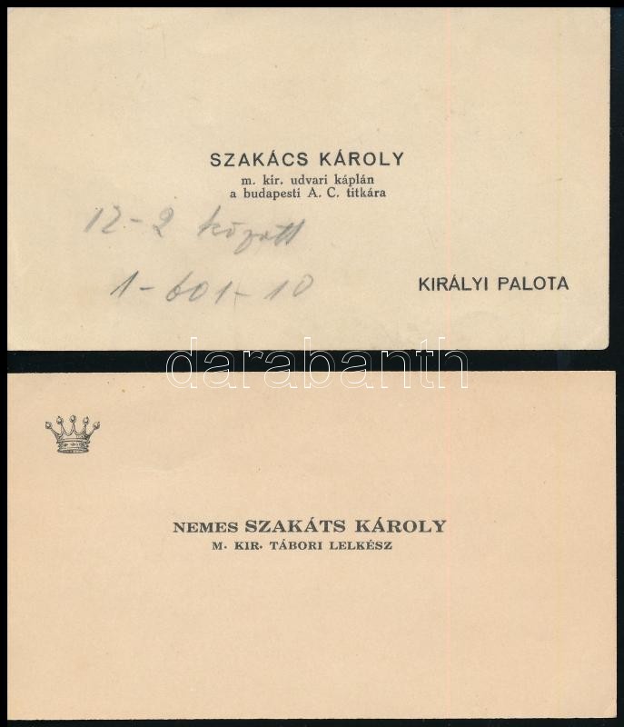 1941 Nemes Szakáts Károly tábori főlelkész, a Budai Királyi Palota udvari káplánjának 2 db névjegye, hátoldalon egy hölgy részére saját kézzel írt soraival, elküldött eredeti borítékban