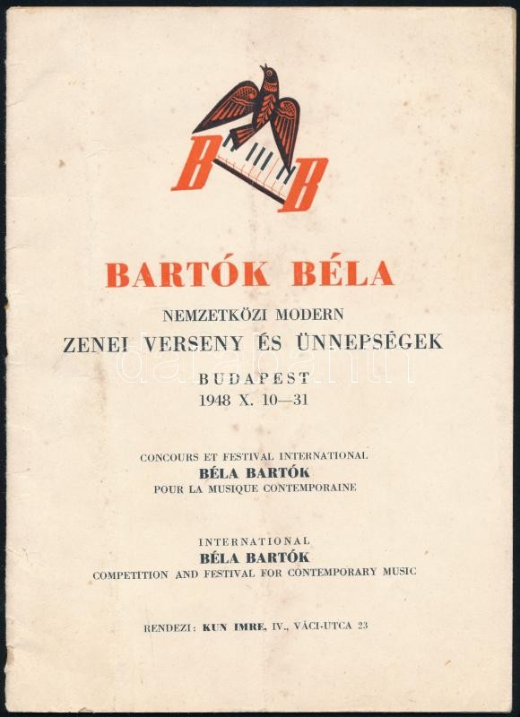 Leírás: 1948 Bp., Bartók Béla nemzetközi zenei verseny és ünnepségek, hátsó borítólapon szakadás, 24p