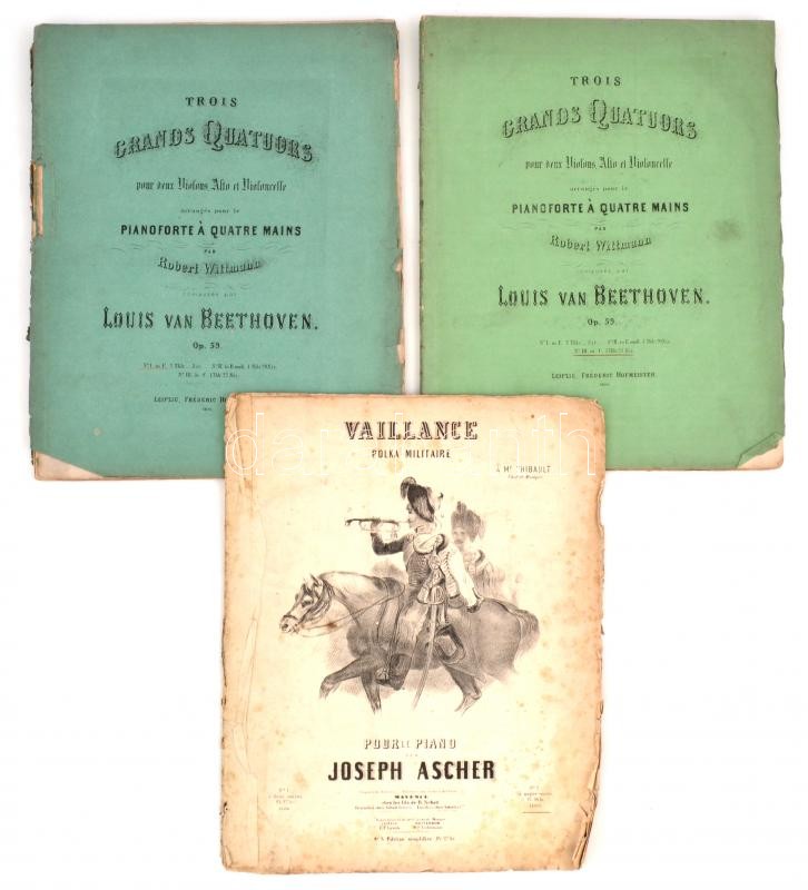 Ludwig van Beethoven: Trois Grands Quatuors.. Op. 59. Leipzig., Hofmeister. (x2.) Változó, kissé viseltes állapotban, szakadozottak, az egyiken borító hiányzik és foltos, szakadozott.