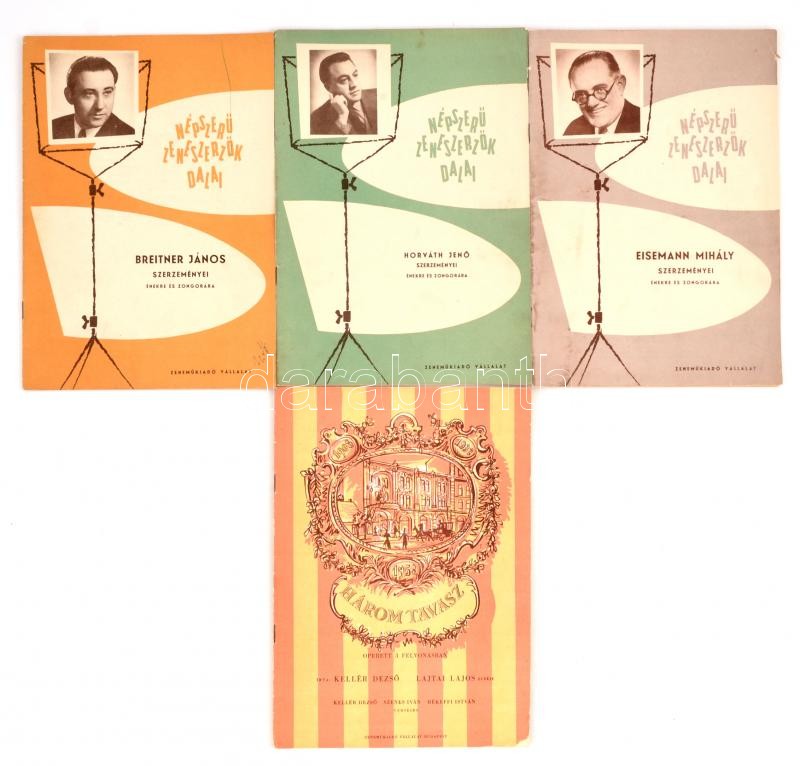 Eisemann Mihály - ; Horváth Jenő -; Breitner János szerzeményei énekre és zongorára. + Kellér Dezső-Lajtai Lajos: Három tavasz. Bp.,1958,Zeneműkiadó. Változó állapotban.