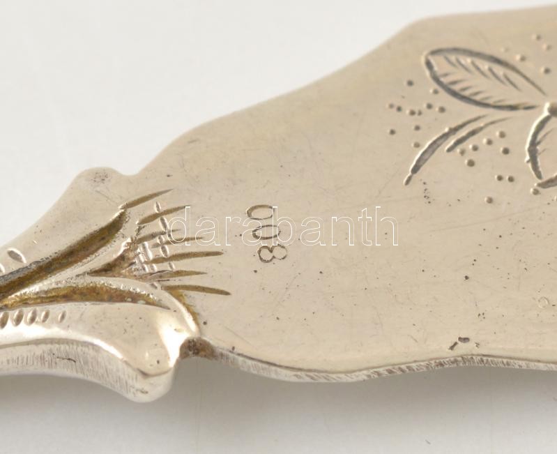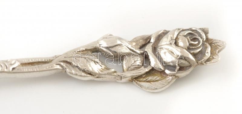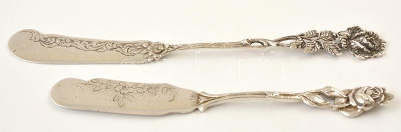 Leírás: Ezüst(Ag) rózsás jelű vajas kés, jelzéssel és jelzés nélkül, h: 14,3 és 17 cm, nettó: 44,3 g