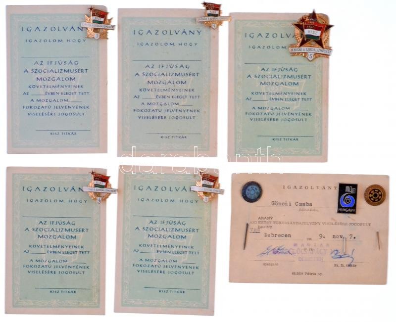 Vegyes jelvény tétel, közte "KISZ" teljesítmény jelvények öt különböző fokozata, kitöltetlen viselői igazolvánnyal valamint "MGM (Magyar Gördülőcsapágy Művek)" három különféle jelvénye, viselői igazolvánnyal T:1-,2