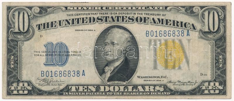 Amerikai Egyesült Államok 1934-1945. (1934A) 10$ "Silver Certificate - kisméretű", sárga pecsét, "William Alexander Julian - Henry Morgenthau Jr." T:III