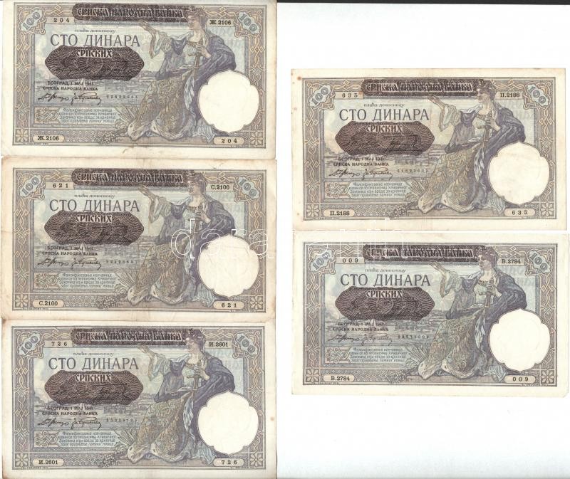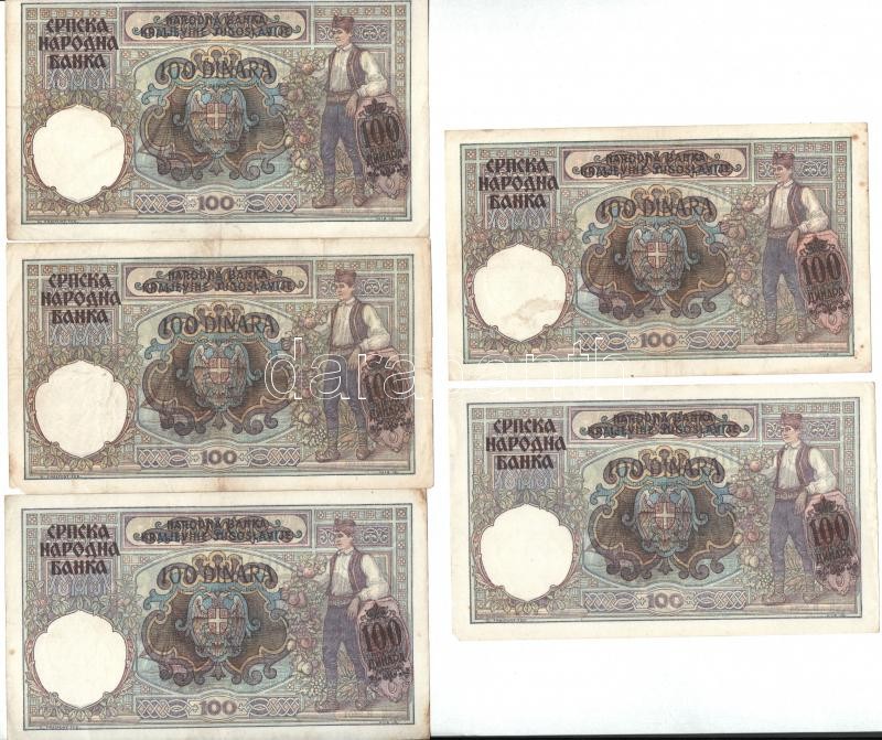 Yugoslavia 1941. 100 Dinara (5x) C:XF-F two with missing corner
