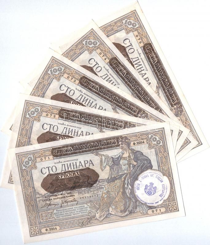 Yugoslavia 1941. 100 Dinara (5x) sequential serials with overprint C:AU stained