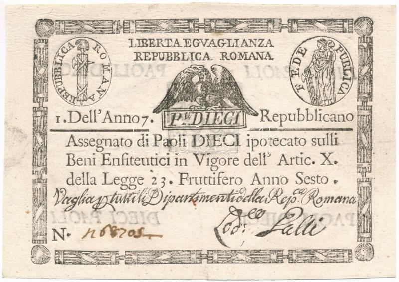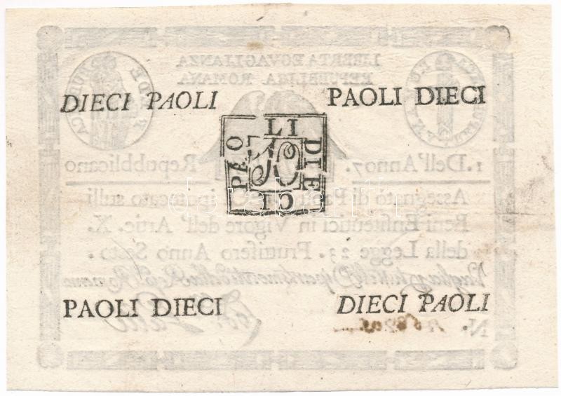 Italian States / Roman Republic / French Occupation 1798. (Dell'Anno 7) 10 Paoli assignata, watermarked paper, value in square overprint on back C:UNC