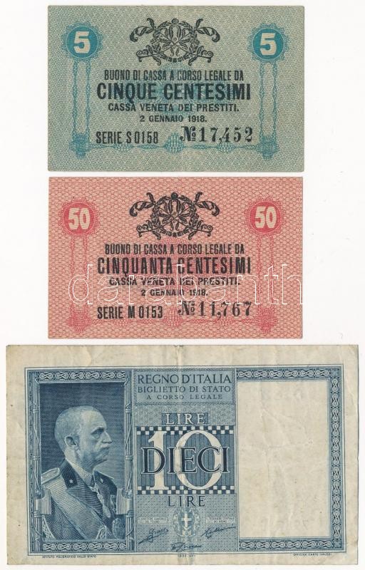 Italy / Venice / Austro-Hungarian occupation 1918. 5 Centesimi + 50 Centesimi + Italy 1938. 10 Lire C:F